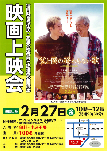 福岡県地域住民・家族介護者向け公開講座 認知症公開講座として、『父と僕の終わらない歌』の上映会を行います。